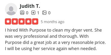 With Purpose Services LLC is committed to providing top-quality duct and dryer vent cleaning with a focus on serving our community. As a locally owned business, I believe in the power of giving back. Through my year-round "Discounts for Donations" initiative, I offer discounts in exchange for donations to local animal shelters, homeless shelters, and programs supporting homeless youth. My mission is to not only improve the air quality in your home but also to help create a brighter, more compassionate future for those in need in our community.